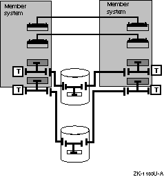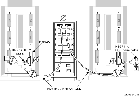 Figure 6-6 shows a configuration with two systems with KZPSA differential SCSI adapters and one single-ended storage shelf with an installed DWZZA-VA SCSI signal converter.