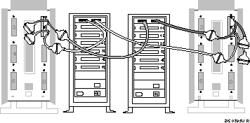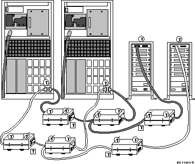 In the configuration shown in Figure 6-2, the SCSI controllers and the storage shelf are single-ended, narrow devices. There is one single-ended bus between the two terminated Y cables.