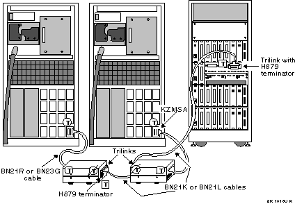 Figure 6-5 shows a configuration consisting of two systems and one HSZ40 DEC RAID controller, all differential devices. There is one shared differential SCSI bus between the terminated H885 trilink connector and terminated BN21W-0B Y cable.