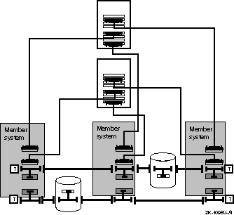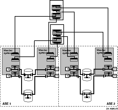 Except for Figure 6-15, the sample configurations in this chapter show redundant MEMORY CHANNEL interconnects and two shared SCSI buses in each available server environment (ASE).