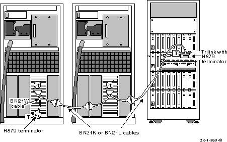Two shared SCSI buses consisting of BN21K or BN21L cables that are connected to the trilink connectors and terminated with H879-AA terminators
