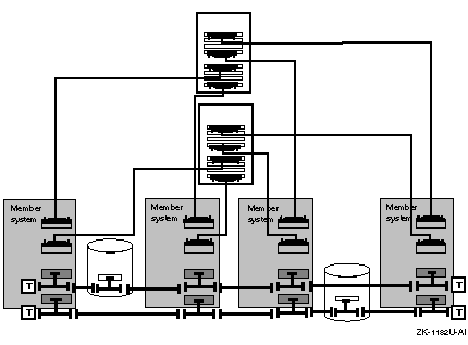 Figure 6-16 shows a Production Server hardware configuration that includes two member systems, two terminated shared SCSI buses, and redundant MEMORY CHANNEL interconnects in a virtual hub configuration (there is no MEMORY CHANNEL hub).