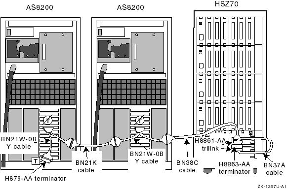 Figure 6-8 shows two AlphaServer 8200 systems in an Available Server configuration with two HSZ70 DEC RAID controllers. Note that the SCSI bus adapters are KZPSA PCI-to-SCSI adapters. In this figure, the HSZ70s are on the end of the shared SCSI bus.