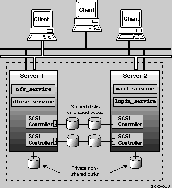 SCSI controllers--Each member system must have at least one supported SCSI controller installed in an I/O bus slot to connect the system to a shared bus. The use of multiple shared SCSI buses allows data to be mirrored across SCSI buses.