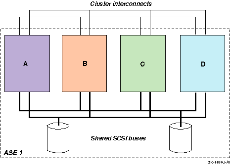Note that whereas only one ASE is supported with TruCluster Available Server Software, multiple ASEs are supported with TruCluster Production Server Software. All systems in an ASE must be on the same shared SCSI bus.