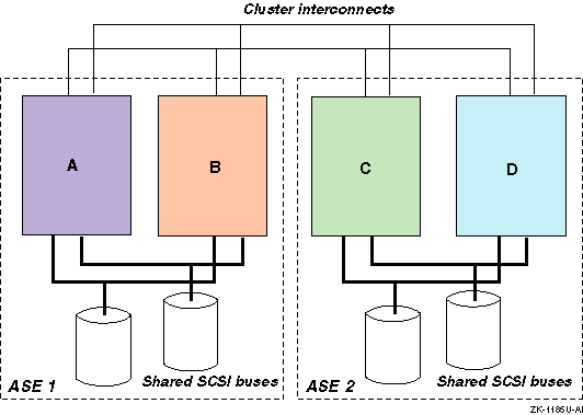 Figure 1-2 shows a four-member configuration with one ASE. Note that all four systems are connected to both shared SCSI buses. This figure can represent either an Available Server or Production Server configuration. With a Production Server configuration, the cluster interconnect is the MEMORY CHANNEL, and with the four-member system configuration shown, there would have to be a MEMORY CHANNEL hub (which is not shown).