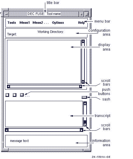 Figure Figure 2-2 shows the components that the main window of a FUSE tool can include. None of the FUSE tool windows looks exactly like the figure; for example, a tool might have multiple display areas and one or more sashes, or one display area with a toggle button.