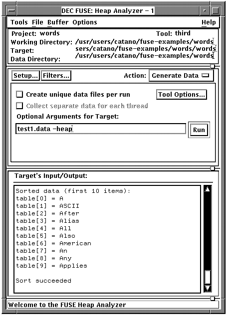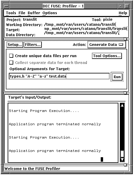 To generate profiling data, choose Generate Data in the Action: options box, specify arguments (if required), and then click on Run.