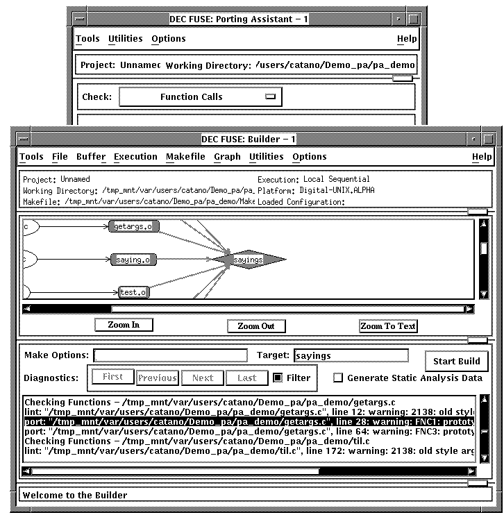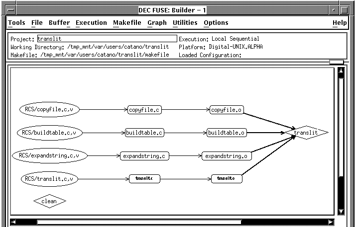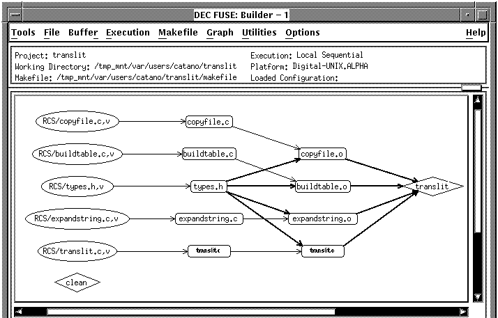 When you click OK in the Create Makefile and Project Manager dialog boxes, t he Builder creates the makefile and configures the Builder to your makefile. To display a graph of your makefile that shows the dependencies between files, choose Graph: Display Graph. The Builder parses the makefile and displays the graph. Include file dependencies are not listed but can be added, as described in Section Section 3.2.1.