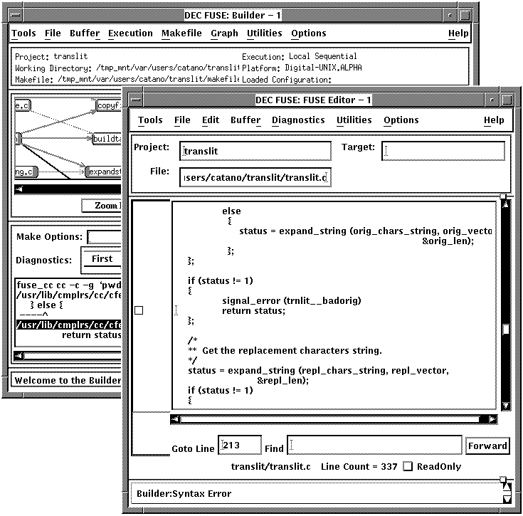 The Builder and Editor windows are synchronized: if you navigate to another message in the Builder transcript area, the Editor automatically repositions the source code to the associated line and annotates it as the currently selected message.