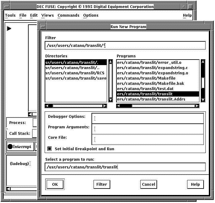 When the Debugger starts, it displays the Run New Program dialog box. The Working Directory defaults to the project directory. Specify the program to run and, optionally, the name of the core file, debugging options, and program arguments (if any). Then click on OK.