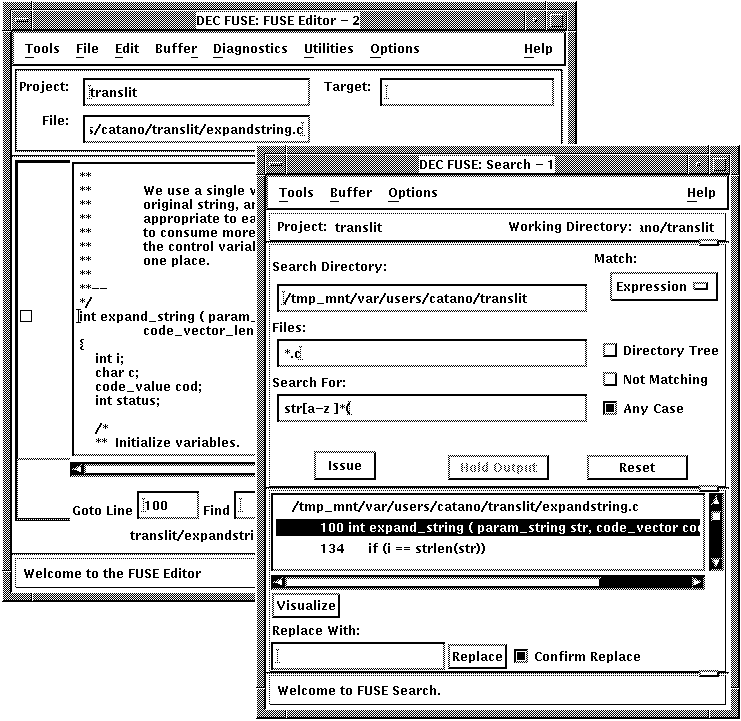 As part of the coding and debugging process, you often have to examine source files. The Search tool makes it easy to find occurrences of regular expressions in text files. Search is integrated with the Editor, giving you a powerful and efficient means to locate character sequences in files (not just program source files) and to view the locations in context.After starting a search for a string in the Search tool, you can display the source code for an occurrence by double clicking on the line in the search results display. The code is displayed in the editor and annotated with a colored icon.