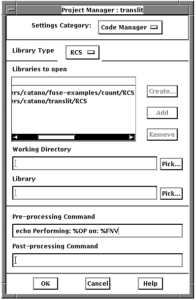 Because you have not yet created any code libraries, you'll first see an informational box that gives you a choice of specifying existing libraries to open or creating a new library. To create a new library, click on the Create Library button in the informational box and enter the pathname of the library and working directory in the Project Manager dialog box. Use the Tool Type: options box to specify either RCS or SCCS as the library manager, then click on the Create... button.
