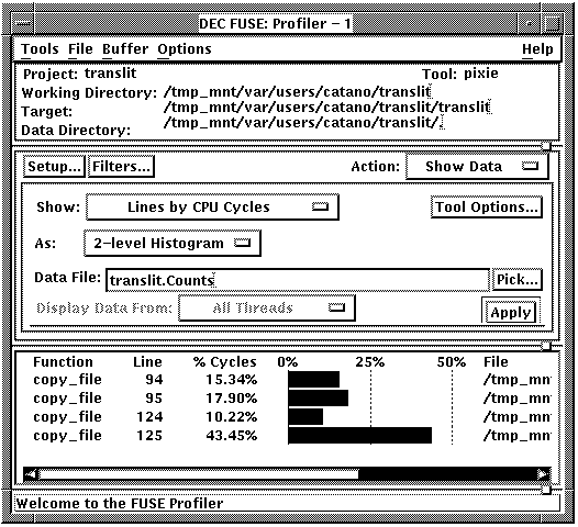 To find out which functions you are executing most frequently and display this information as a histogram, click on Apply. By default, the Show: options box is set to Functions by CPU Cycles and the As: options box is set to Histogram.