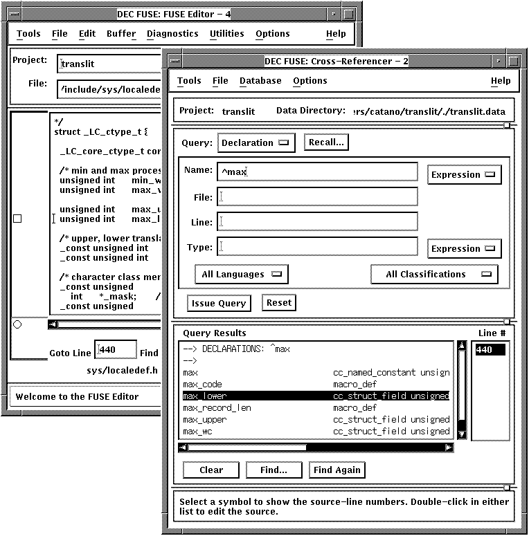 The results of the query are displayed in the lower half of the Cross-Referencer window. When you click on a symbol in the first column, the line numbers for the selection are displayed in the second column.