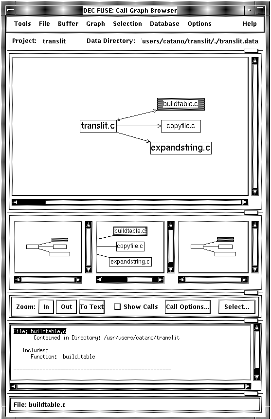 You can use the main window to display a graph of functions and their call relationships in your application as nodes connected by arrows. You can also view the containment hierarchy by selecting a specific node and choosing Selection: Show Contained. When the files of an application are distributed over several directories, the initial call graph will show call relationships at the directory level.