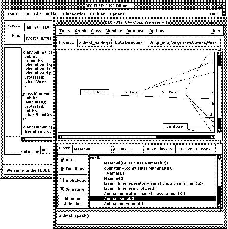 The C++ Class Browser is an optional tool available with the DEC FUSE Support for C++ license. This tool displays the class hierarchy for a C++ program and lets you bring the source code for selected classes and members into the Editor.
