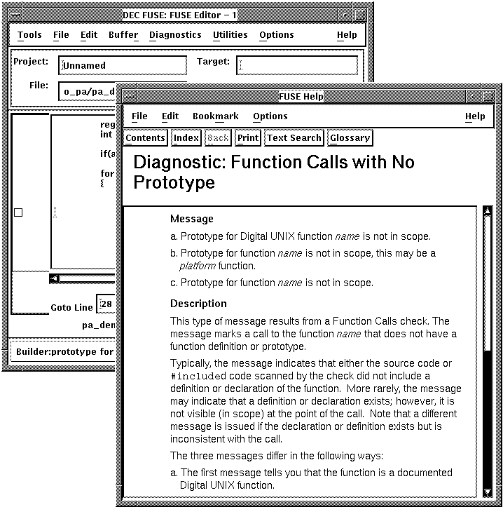 After you run checks in the Porting Assistant, you can use either the FUSE Editor or one of the supported Emacs editors to review any diagnostic messages and associated code. To get help on a diagnostic message, choose Help on Diagnostic from the Diagnostics menu.