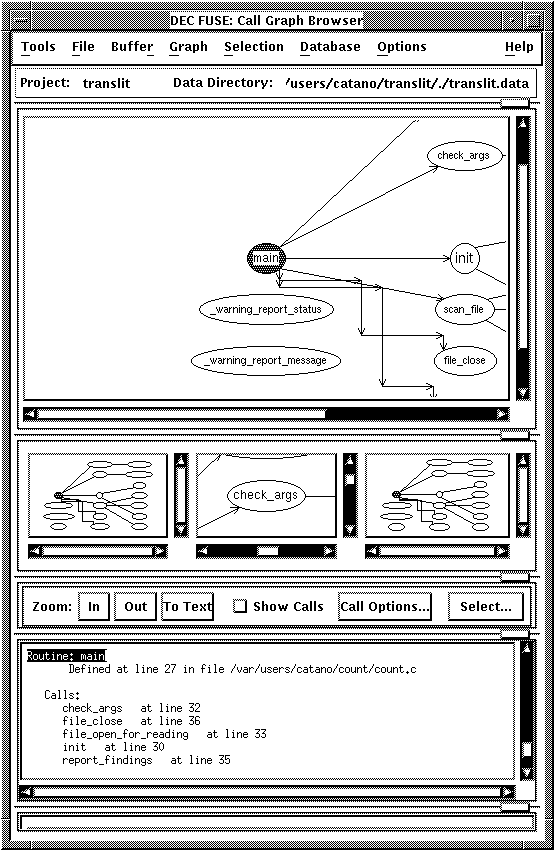 The Call Graph Browser provides a graphical view of the call relationships and containment hierarchy within a directory, source file, object file, or executable file. The Call Graph Browser works with all languages supported by FUSE. Figure Figure 6-1 shows the Call Graph Browser main window.