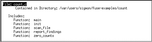 | Function | The file containing the function and the location of the routine in the file, all calls from within the function and the line number of the call, and functions that call it. |