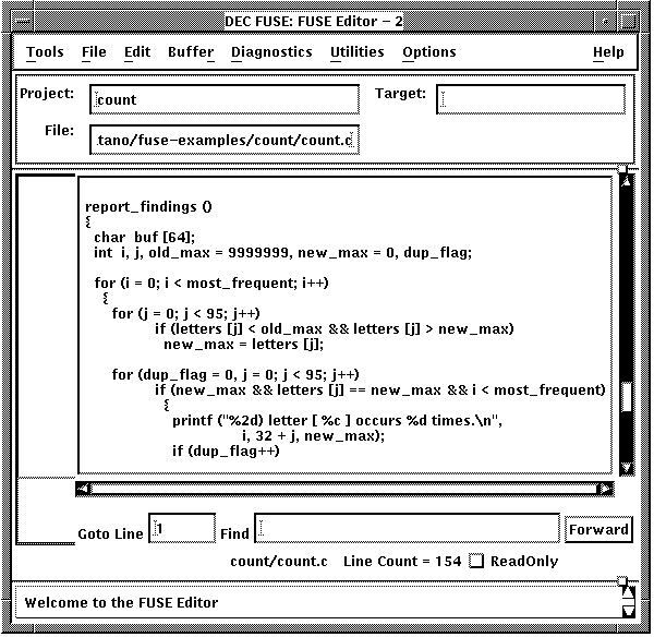 The FUSE Editor has menu items that work directly with the Builder, Code Manager, Man Page Browser, and Cross-Referencer. No FUSE tools are available from the vi Editor.