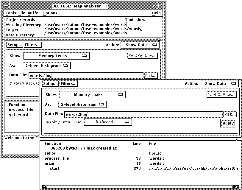 The FUSE Heap Analyzer finds and displays memory errors and memory leaks in a program. You can view the data in graph or text format.
