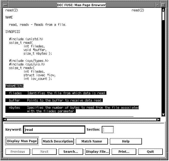 Buttons and fields let you specify the action you want to take, such as using the Search... button to find a specified string in the text of a displayed reference page. Use the Keyword field in conjunction with the Display Man Page or Search buttons to locate a reference page. Use the Section field to limit the search to a particular section.