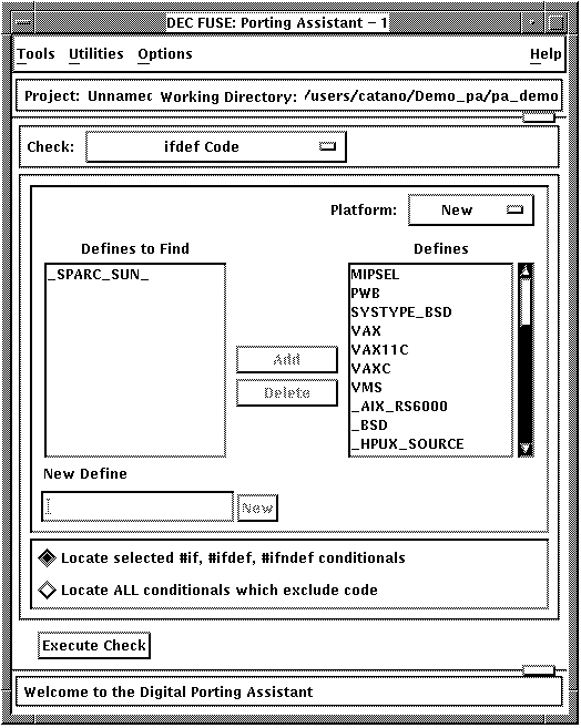 For the Include Files check: Accept the default directory search list or use the New Directory Path field and the New button to add new directories to the Search list. Use remaining buttons to make additional changes to the list. For the Function Calls check: No additional options. For the 32-Bit Dependencies check: Click on the toggle buttons to specify the options you want to check for. For the Platform Assumptions check and ifdef Code check: Select options displayed in the list boxes and use the Add and Delete buttons. For the Makefile check: Use toggles, text fields, and options menus to specify details on how you want the the check to be run. |