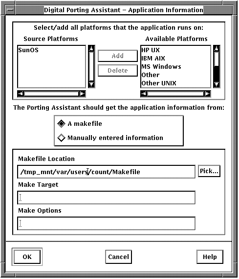 The Porting Assistant can generate a porting-specific makefile from your makefile, although you still have the option of manually specifying information if you choose not to rely on your makefile.