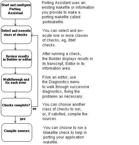 The Porting Assistant lets you run several classes of portability checks on your application's code. Some of the classes of checks allow you to refine the check operation by toggling buttons on and off in the work area of the main window or selecting options in list boxes. When you finish a check operation, you can use the editors to walk through diagnostic messages and fix individual sections of code.