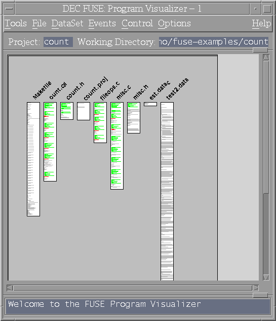The Program Visualizer provides the ability to display large amounts of data in a condensed format. The Program Visualizer main window uses file pictographs (vertical, rectangular graphics) to give a visual representation of the size and content of source files.
