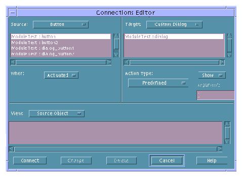 In its simplest form a connection is a programmatic relationship between a source object and a target object: when I click on Button A I want Dialog Box B to be displayed. This type of connection is described below in "To Make a Connection between Two Objects"."