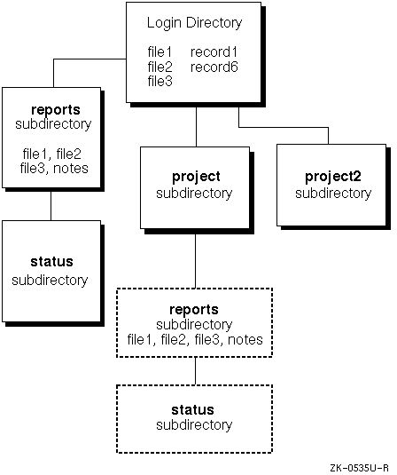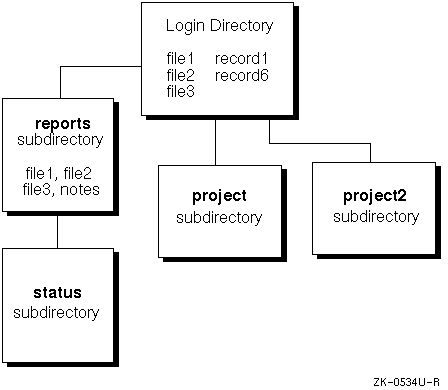 Figure 4-1 shows the new file system tree structure. The project, project2, and reports directories are located one level below your login directory, and the status subdirectory is located one level below the reports directory.