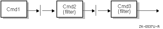 Figure 7-1 represents the flow of input and output through a pipeline. The output of the first command (cmd1) is the input for the second command (cmd2); the output of the second command is the input for the third command (cmd3).