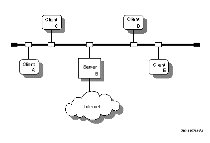 Figure 11-2 shows a sample client/server configuration in which host B is configured as a mail server and hosts A, C, D, and E are configured as mail clients. This is useful in larger enterprise networks that consist of multiple domains and connections to the Internet or other networks.