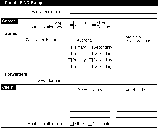 Appendix A contains a worksheet that you can use to record the information that you need to provide to configure BIND. If you are viewing this manual online, you can use the print feature to print a copy of this part of the worksheet.