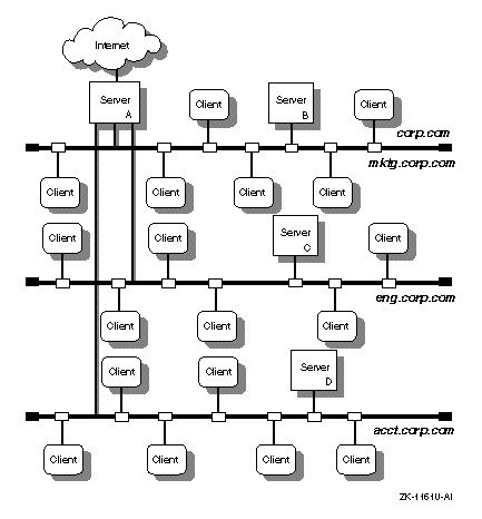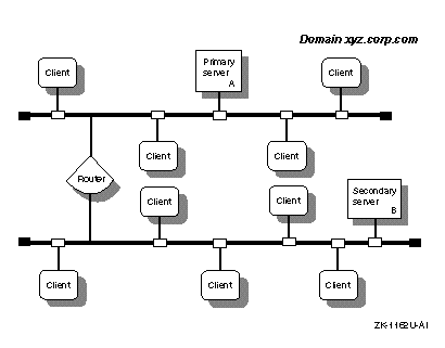 Figure 6-1 shows a domain in which there are two servers, one on each subnet, and multiple clients. The Host A server has primary authority for the zone and maintains the database files for the zone. The Host B server has secondary authority for the zone, obtaining a copy of the zone database from Host A and answering queries from clients.