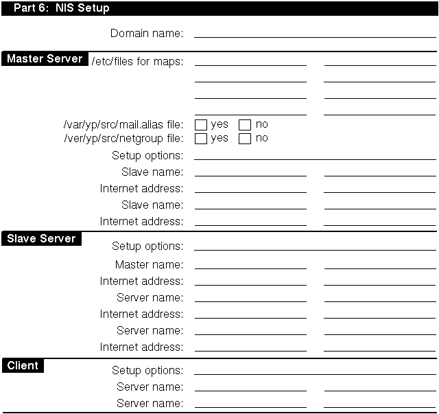 Appendix A contains a worksheet that you can use to record the information that you need to configure NIS. If you are viewing this manual online, you can use the print feature to print a copy of this part of the worksheet.