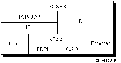 Digital UNIX supports both Ethernet and 802.2 data link services. DLI and IP both run over Ethernet and 802.2. FDDI and 802.3 use the 802.2 Logical Link Control (LLC) as their data link sublayer. TCP and UDP run over IP, providing data delivery and message routing services to the programs that use them. Because DLI provides direct access to the data link layer it does not provide the higher-level services that TCP and UDP do.