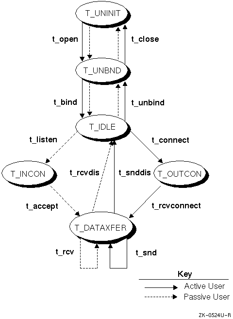When using a connection-oriented transport service, such as TCP, the transport user must establish a connection between itself and a peer transport user with a t_connect function, specifying an active endpoint, before sending data. In a transport connection, the transport user initiating the connection is the active user, or client, and the peer transport user responding to the connection request is the passive user, or server. Figure 3-2 summarizes the relationship between transport providers, transport users, and transport endpoints.