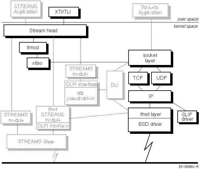 Figure 3-1 highlights XTI and its relationship to the Digital UNIX implementation of the Internet Protocol suite. It also shows how XTI and the Internet Protocol suite fit into the rest of the network programming environment.