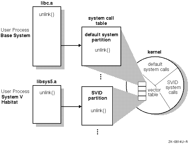 When you link your program and your PATH is set for the System V habitat, libsys5 is searched to resolve references to system calls. As Figure B-1 illustrates, the unlink() system call invoked by libsys5 points to an entry in the System V partition of the system call table. This maps to a different area of the kernel than the mapping for the default system unlink() system call.