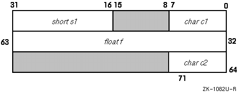 The first component of the structure, c1, starts at offset 0 and occupies the first byte. The second component, s1, is a short; it must start on a word boundary. Therefore, padding is added between c1 and s1. No padding is needed to make f and c2 fall on their natural boundaries. However, because size is rounded up to a multiple alignment, three bytes of padding are added after c2.