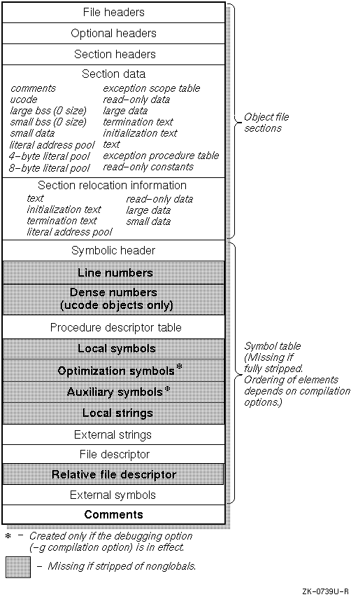 Object files also contain a symbol table, which is also divided into sections. Figure 7-1 shows all of the possible sections in a symbol table. The sections of the symbol table that appear in a final object file can vary: