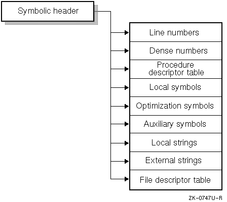 The symbol table is comprised of several subtables. The symbolic header acts as a directory for the subtables; it provides the locations of the subtables and gives their sizes.
