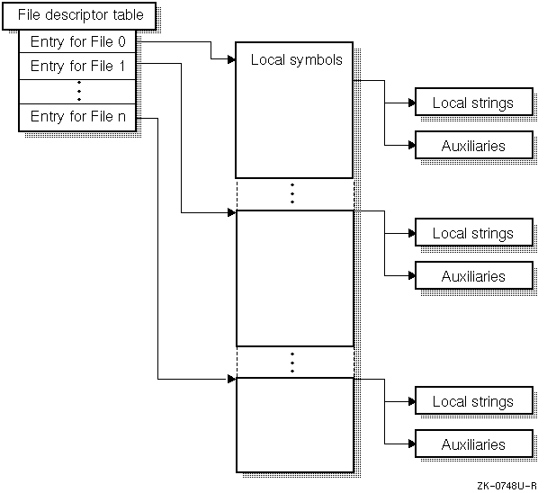 A unique local symbol table exists for every source and include file; the compiler locates the table through an offset from the file descriptor entry that exists for every file. The entries in the local symbol table can reference related information in the local string table and auxiliary symbol table. This relationship is shown in Figure 8-3. (See Section 8.2.4 for additional information on the local symbol table.)