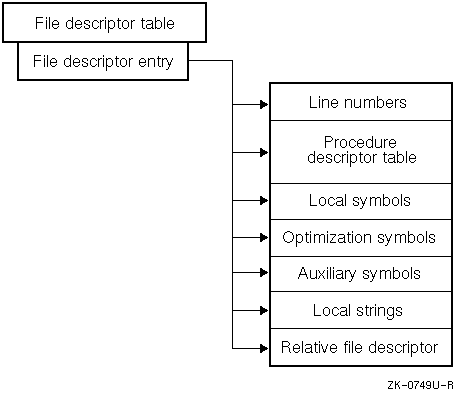 The file descriptor entry allows the compiler to access a group of subtables unique to one file. The logical relationship between entries in the file descriptor table and its subtables is shown in Figure 8-5.