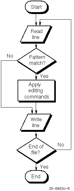 When you start sed, the editor reads and compiles the command script, checking for syntax and organizing the commands for efficiency. It then reads the input file one line at a time into an area of memory called the pattern space. The editor then tries to match the addresses specified by the commands in the script, one after another, to the lines in the pattern space. Whenever a command's address matches any line or lines in the pattern space, sed applies that editing command to the matched text.