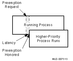 Figure 1-1 and Figure 1-2 illustrate the process preemption latency that can be expected from a nonpreemptive kernel and a preemptive kernel. In both figures, a higher-priority realtime process makes a preemption request, but the amount of elapsed time until the request is honored depends on the kernel. Latency is represented as the shaded area.