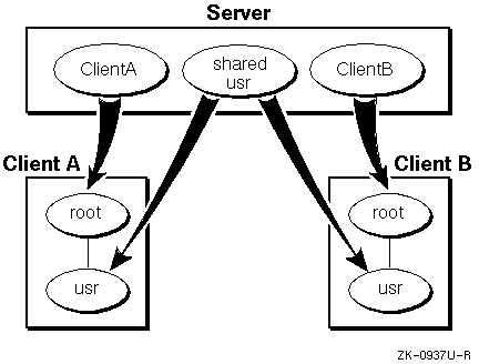 In Figure 9-4, the small boxes represent what the clients think they see; the arrows show how the real disk areas on the server are mounted by the client to produce this view.